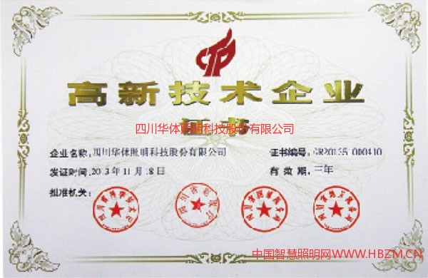 四川華體照明科技股份有限公司榮獲高新技術(shù)企業(yè)證書