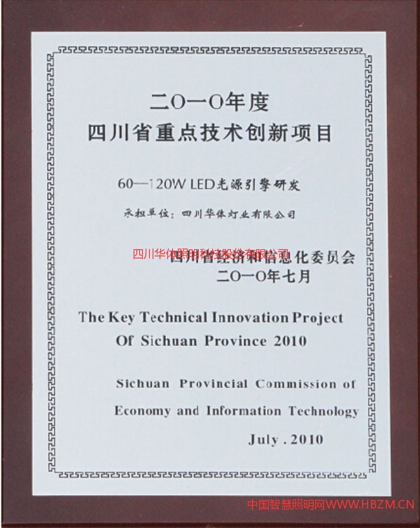 證書(shū)介紹 2010年度四川省重點(diǎn)技術(shù)創(chuàng)新項(xiàng)目,60-120W LED光源引擎研發(fā),承擔(dān)單位四川華體燈業(yè)有限公司